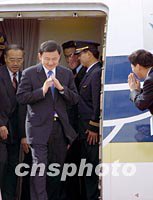泰國(guó)總理他信(左二)十九日中午十三時(shí)到達(dá)上海浦東機(jī)場(chǎng),他將參加二十一日的APEC領(lǐng)導(dǎo)人非正式會(huì)議。中新社圖 劉殊瑾 攝