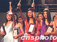 “沙溪休閑”杯中國模特之星大賽在廣東中山市舉行,中國各省市的59名佳麗參加了角逐,上海選手唐雪萍(中)獲得大賽冠軍、陜西選手曾愛琳(右)獲亞軍、大連的郝麗娜獲季軍(左)。中新社圖 東方 攝