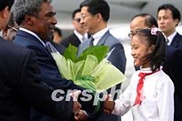 10月20日,前來參加亞太經合組織領導人非正式會議的巴布亞新幾內亞總理梅克雷·莫勞塔抵達上海,這是上海兒童在向莫勞塔(左)獻花。
