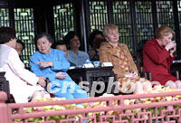 出席APEC會議的經濟體領導人配偶二十日在上海豫園游覽,中國國家主席江澤民夫人王冶坪陪同韓國總統金大中夫人李姬鎬,俄羅斯總統普京夫人柳德米拉·普京,澳大利亞霍華德總理夫人珍妮特·霍華德(左至右)等觀看文藝表演。中新社記者 王瑤 攝