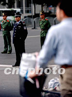 出于安全考慮,浦東陸家嘴地區今天擴大了交通管制的范圍。地鐵部分封站、延安路隧道禁行、公交車管制,令這里沒有了蜂涌的人群。被清場的陸家嘴,車少人稀,空前寂寞。行走街區多見藍色衣服的保安紅色衣著的志愿者,和綠色衣服的武警,要不就是那些掛著證件行色匆匆的記者。