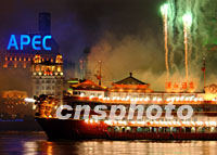 上海黃浦江上二十日夜龍舟噴射煙火,慶賀APEC峰火隆重開幕。中新社記者 賈國榮 攝