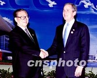 10月20日,中國國家主席江澤民在上海國際會議中心迎接美國總統布什。中新社圖