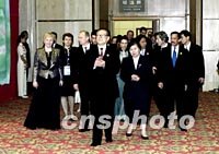 10月20日,中國國家主席江澤民和夫人王冶坪在上海國際會議中心為參加2001年亞太經合組織(APEC)領導人非正式會議的領導人和配偶舉行歡迎晚宴。這是江澤民主席夫婦和貴賓步入宴會大廳。中新社圖