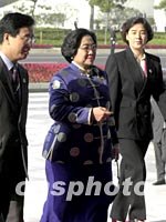 10月21日上午,出席2001年亞太經合組織領導人非正式會議的印度尼西亞總統梅加瓦蒂(中)抵達上海科技館。中新社圖