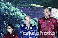菲律賓總統(tǒng)阿羅約、俄羅斯總統(tǒng)普京和新加坡總理吳作棟21日站在上?萍拣^中國萬里長城圖案背景前,聆聽中國國家主席江澤民宣讀APEC《領(lǐng)導(dǎo)人宣言》。亞太經(jīng)合組織第九次領(lǐng)導(dǎo)人非正式會(huì)議21日在上海圓滿閉幕。中新社記者 王瑤 攝