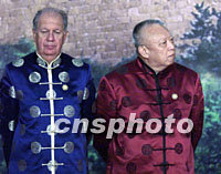 美國總統(tǒng)布什身穿唐裝二十一日站在上海科技館中國萬里長城圖案背景前,聆聽中國國家主席江澤民宣讀APEC《領(lǐng)導(dǎo)人宣言》。亞太經(jīng)合組織第九次領(lǐng)導(dǎo)人非正式會(huì)議二十一日在上海圓滿閉幕。中新社記者 王瑤 攝
