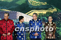 新加坡總理吳作棟、泰國總理他信、美國總統(tǒng)布什和越南總理潘文凱身穿唐裝21日站在上?萍拣^中國萬里長城圖案背景前,聆聽中國國家主席江澤民宣讀APEC《領(lǐng)導(dǎo)人宣言》。亞太經(jīng)合組織第九次領(lǐng)導(dǎo)人非正式會(huì)議21日在上海圓滿閉幕。中新社記者 王瑤 攝