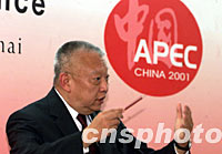 香港特別行政區(qū)行政長官董建華二十一日晚在上海APEC新聞中心舉行記者會時,再度將香港與上海比做中國經(jīng)濟發(fā)展的兩只“發(fā)動機”。中新社記者 毛建軍 攝