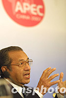 參加APEC領導人非正式會議的馬來西亞總理馬哈蒂爾,二十一日在上海國際新聞中心的新聞發布會上說,反對國際恐怖主義是無條件的。中新社記者 劉殊瑾 攝