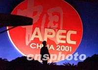 十月二十一日夜,一名上海警官最后巡視在浦東,APEC峰會在此間的上海科技館落幕。中新社記者 賈國榮 攝