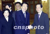 國務院總理朱镕基四日離開北京前往文萊出席10+3、10+1領(lǐng)導人會議并對印尼正式訪問,外經(jīng)貿(mào)部部長石廣生(右二)、中國人民銀行行長戴相龍(左二)等中國經(jīng)濟高官隨同朱總理出訪。中新社記者 滿會喬 攝