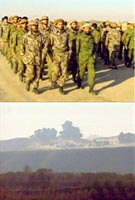 正當阿富汗北方聯(lián)盟和美空軍采取局部分割、殲滅塔利班武裝力量的戰(zhàn)略運作之時,北方聯(lián)盟的軍事領(lǐng)導人巴廖萊日前向媒體透露,目前北方聯(lián)盟與塔利班雙方的兵力同為12萬人,相差無幾。上圖為日漸擴充的北方聯(lián)盟部隊,下為美空軍六日轟炸塔前沿陣地。