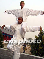 兩名參加2001年夏蒙Manhunt世界男模大賽的選手七日在北京香山團(tuán)城演繹中國功夫。來自世界四十多個國家的男模冠軍將于本月十二日角逐本屆世界十佳男模。中新社圖 武仲林 攝