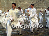 身穿中國傳統(tǒng)服裝的四十多名世界各國男模冠軍七日在北京香山團(tuán)城演示剛剛學(xué)會(huì)的太極拳。他們即將參加在北京舉行的2001年夏蒙Manhunt世界男模大賽。中新社圖 武仲林 攝