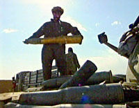 阿富汗反塔聯盟一名戰士十日在馬扎里沙里夫附近搬運彈藥。阿富汗北方聯盟方面宣稱,他們已進入塔利班控制的北方軍事重鎮馬扎里沙里夫,為進一步進攻阿富汗首都喀布爾鋪平了道路。
