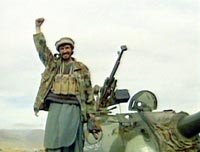 阿富汗北方聯(lián)盟一名士兵十二日在坦克上歡慶勝利。阿富汗北方聯(lián)盟日前氣勢如虹,繼奪取北部重鎮(zhèn)馬扎里沙里夫和北部四個(gè)省份后,宣稱又攻占了前首都塔盧坎。