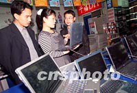 入世后,高科技產業將成為國民發展的重頭戲,北京聯想等擁有著名品牌的大型高科技企業面臨更大的機遇和挑戰,圖為北京中關村電腦城的電腦銷售人員正在向客戶介紹最新面世的電腦。中新社記者 張勤 攝