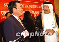 第四屆WTO部長級會議十二日在多哈舉行中國臺北加入世貿組織議定書簽字儀式。圖為會議主席卡塔爾財政、經濟和貿易大臣卡邁爾,WTO總干事穆爾等向臺北代表團團長林信義表示祝賀。中新社記者 錢興強 攝