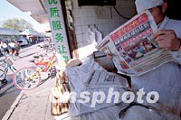 美國民航墜機事件再次令北京市民震驚。北京一家餅鋪老板十三日清晨剛開張,便迫不及待閱讀刊載美墜機事件的當日報紙。中新社圖 劉殊瑾 攝