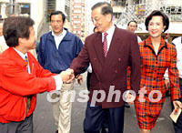 國民黨籍的臺北市長馬英九被稱為本次臺灣選舉的五大競選天王(陳水扁、李登輝、連戰、宋楚瑜、馬英九),"小馬哥"清晨投票后趕到國民黨主席連戰的選區陪同連戰夫婦投票時,受到連戰住區的里長何信隆的歡迎。中新社記者 任晨鳴 攝