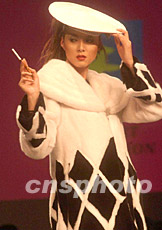 在北京舉辦的“2001中國國際時裝周”二日舉行“張天愛、王盛德時裝發布會”。圖為模特展示張天愛的新款作品。中新社記者 錢興強 攝