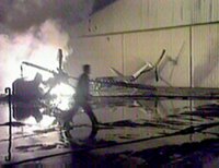 以色列三日向加沙地區發射十四枚導彈,對此前以境內發生的一連串爆炸事件進行報復,巴勒斯坦民族權力機構主席阿拉法特的住所、辦公室及兩架直升機在襲擊中被摧毀。圖為消防人員在被摧毀的直升機前滅火。