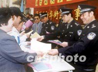 北京警方日前在街頭向市民發放嚴打宣傳材料,以取得百姓對嚴打整治斗爭的支持。中新社圖 黃然 攝