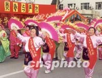 北京市通州區市民周末身著演出服裝走上街頭,載歌載舞,參加警方組織的嚴打斗爭動員活動。中新社圖 黃然 攝