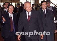 董建華抵達(dá)北京述職 將與江澤民等領(lǐng)導(dǎo)人會(huì)面 2001年12月19日 13:04 ![]() 前來(lái)北京述職的香港特別行政區(qū)行政長(zhǎng)官董建華十九日中午抵達(dá)北京港澳中心并接受記者訪問(wèn)時(shí)說(shuō):“為香港真正做點(diǎn)事是我的目標(biāo)”。中新社記者 毛建軍 攝 ![]() 前來(lái)北京述職的香港特別行政區(qū)行政長(zhǎng)官董建華十九日中午抵達(dá)下榻的北京港澳中心,受到國(guó)務(wù)院港澳辦公室副主任陳佐洱(左一)等人的迎接。中新社記者 毛建軍 攝