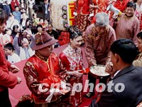 佛山民俗文化節首次舉辦中式古典集體婚禮,新人在萬福古戲臺上拜堂別有一番情趣。圖為伴娘捧著喜糖托盤,讓新人敬獻給雙親。中新社圖 辛述之 攝