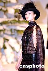 香港時裝節展示黑色女冬裝!跋愀蹠r裝節2002秋冬系列”的“冬日傳奇”時裝展示1月15日在香港會展中心舉行,歐洲模特在“冰天雪地”中展示香港設計師最新設計的黑色女冬裝。中新社傳真 任晨鳴 攝