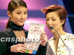 香港歌后鄭秀文、陳慧琳因上周發生倆人歌迷沖突而傳出不和之聞,1月18日晚倆人在“十大金曲”頒獎禮上攜手登臺主持儀式。中新社記者任晨鳴 攝