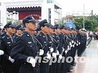 20日,廣東肇慶警方在該市市區牌坊廣場舉行嚴打誓師大會,一千三百多名警察組成四個方隊,并同時展示了百余輛各類警用車輛和各種警械裝備。中新社圖 黃耀輝 攝