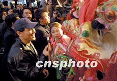 名揚海外的“功夫皇帝”李連杰二十三日在北京新東安商場影視城為其新作《宇宙追緝令》做宣傳,一隊舞獅者在商場門前迎接闊別家鄉多年的李連杰,李連杰高興地為獅子點睛。中新社記者 李剛 攝