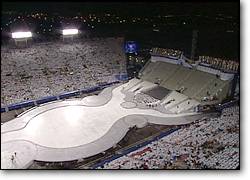 圖文:第十九屆冬奧會如期在美國鹽湖城開幕 2002年02月09日 10:29 ![]() 冬奧會開幕式俯瞰 中新網北京2月9日消息:盡管剛剛經過一場大雪,氣候惡劣,但第19屆冬奧會還是如期于當地時間周五晚間9時(北京時間今天上午10時)在美國猶他州鹽湖城如期舉行。 美國總統布什和國際奧委會主席羅格出席在鹽湖城萊斯-埃克爾斯奧林匹克運動場舉行的開幕式。布什莊嚴宣布說:“我宣布鹽湖城運動會召開。我宣布冬奧會開幕”。 剛剛在紐約世貿廢墟中挖掘出的殘損美國國旗在萊斯-埃克爾斯奧林匹克運動場冉冉升起。人們的歡聲笑聲連成一片。