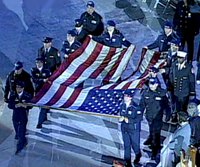 紐約世貿中心廢墟里挖出的殘破的美國國旗,在運動員、消防隊員和警察護送下,進入第十九屆美國鹽湖城冬季奧運會開幕式會場。第十九屆冬季奧運會二月八日(當地時間)在美國鹽湖城開幕。