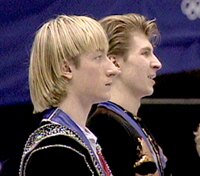 在第十九屆冬奧會花樣滑冰男子自由滑比賽中,俄羅斯選手亞古丁(右)和普拉申科(左)分別獲得這個項目的冠軍和亞軍。