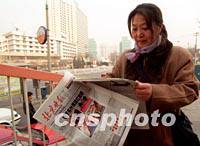 一位從北京香格里拉飯店前匆匆而過的市民,正在專心地閱讀有關布什訪華的消息。設在該飯店內的白宮新聞發布廳和中方新聞中心已于今日啟動。中新社圖 張宇 攝