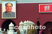 一位中國人民解放軍士兵二十一日上午在北京天安門前執行執勤任務,天安門廣場井然如常。美國總統布什二十一日上午抵達北京,開始為期兩天的工作訪問。中新社記者 劉殊瑾 攝