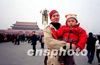 一位美國留學生二十一日在北京天安門前懷抱中國兒童合影。美國總統布什的來訪,對兩國人的友情是一個促進。中新社圖 劉殊瑾 攝
