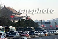 美國(guó)總統(tǒng)布什訪華,二十二日的北京天安門飄揚(yáng)著中美國(guó)旗,路上行速著中美合作的環(huán)保清潔燃料巴士。中新社記者 賈國(guó)榮 攝
