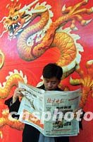 一位做生意的河南青年22日在北京著名商業區王府井的新東安市場前,專心致致地閱讀美國總統布什訪華的有關報道。中新社記者 張勤 攝