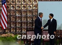 中國國家副主席胡錦濤二十二日在北京清華大學與訪華的美國總統布什握手。中新社記者 賈國榮 攝