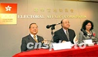 香港選舉管理委員會主席胡國興(中)、委員梁乃鵬(左)及成小澄博士28日出席宣布董建華為香港特區(qū)第二任行政長官候任人新聞發(fā)布會。中新社圖 洪少葵 攝