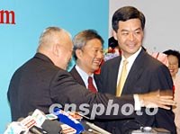 董建華得知成為香港特別行政區(qū)第二任行政長官候任人后,與競選辦公室人員握手。中新社記者 任海霞 攝