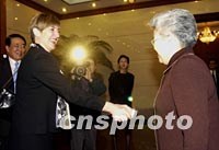 中國國務委員、申辦2010年上海世博會委員會主任委員吳儀,十一日上午在北京釣魚臺迎接世博會考察團團長、國際展覽局副主席兼執委會主席卡門·塞文女士。中新社記者 鄒憲 攝