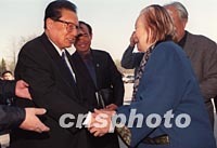 前全國人大常委會委員長喬石12日參觀在北京中華世紀壇舉辦的“吳作人和他的朋友--吳作人精品暨吳作人國際美術基金會接受捐贈作品展”,與著名藝術教育家吳作人先生的夫人肖淑芳親切握手。中新社記者 張勤 攝