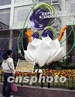 國際展覽局十二日到滬考察中國申辦二○一○年上海世博會的各項情況,申城街頭豎立起玉蘭花申博徽標。中新社圖 湯彥俊 攝