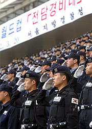 韓國警方成立“世界杯安全警備隊(duì)”保持治安 2002年03月21日 08:28 ![]() 韓國世界杯安全警備隊(duì)枕戈待旦,全力為世界杯保駕護(hù)航(圖據(jù)韓國中央日報(bào)) 中新網(wǎng)北京3月21日消息:承辦世界杯賽事的漢城、光州、蔚山昨天分別成立了專門負(fù)責(zé)安全事務(wù)的“世界杯安全警備隊(duì)”,以為即將到來的世界杯安全保障做準(zhǔn)備。 據(jù)悉,韓國出動(dòng)的警備隊(duì)員都是具有警衛(wèi)經(jīng)驗(yàn)或是精通外語的警察。其中,漢城警備隊(duì)的人數(shù)為9000人,光州為3000人,蔚山為2590人。 在世界杯期間,這些“安全警備隊(duì)員”將被分配在球場、機(jī)場、參賽隊(duì)的住宿設(shè)施以及新聞中心等地,從事維護(hù)交通秩序和人員安全以及反恐等21個(gè)領(lǐng)域的安全活動(dòng)。